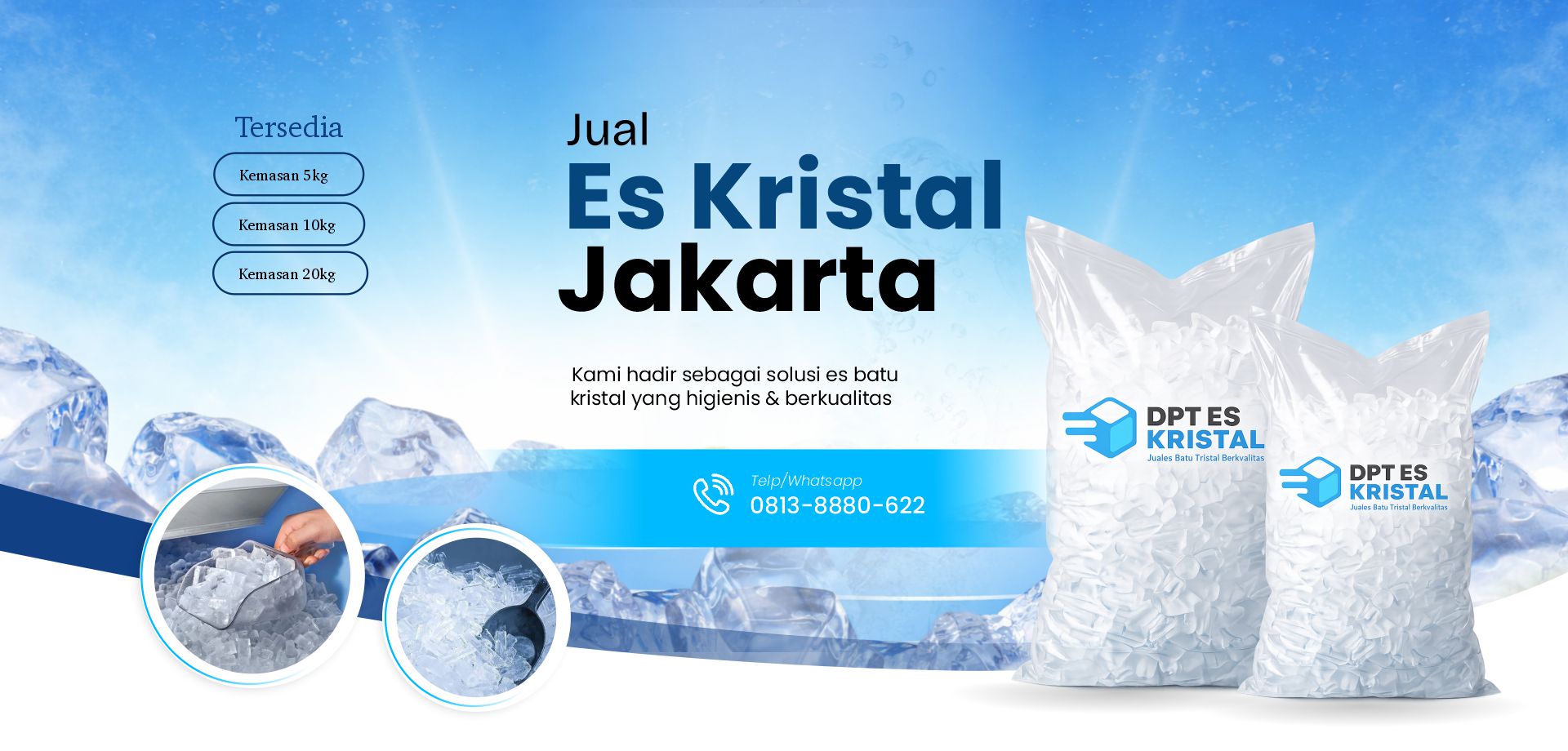 DPT Es Kristal adalah pabrik es batu kristal yang berkomitmen menyediakan produk es berkualitas tinggi untuk berbagai kebutuhan usaha maupun personal. Kami memproduksi es dari air pilihan yang telah melalui proses filtrasi modern dan teknologi UV, sehingga menghasilkan es yang jernih, higienis, dan aman untuk dikonsumsi.